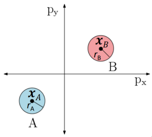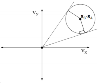 In English this means that the velocity obstacle of A induced by B is the set of all velocities such that there exists a constant \(\tau \ge 0\) such that \(\tau \vec{v}\) is within the disk centered at \(x_{B}-x_{A}\) with radius \(r_{A}+r_{B}\).