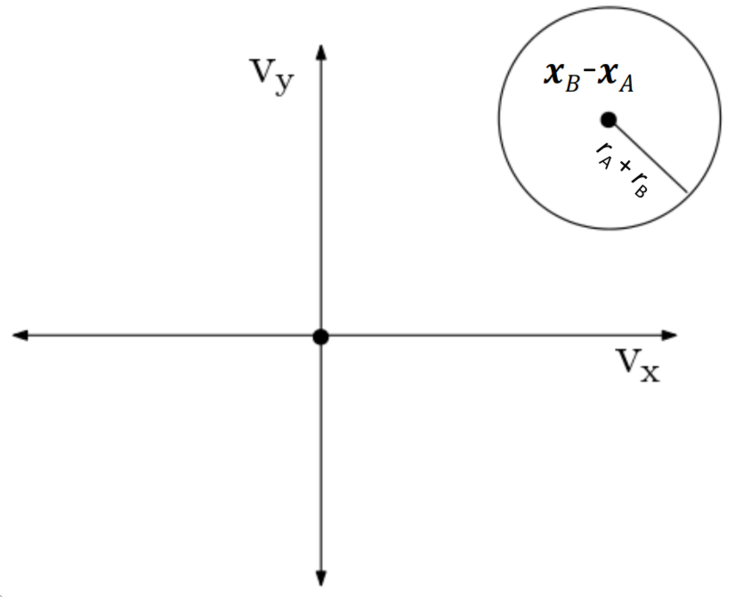 Now every point in this space denotes a velocity. The question now is what is the set of velocities that will lead to a collision. This set is the \(VO_{A|B}\), or the velocity obstacle of \(A\) induced by \(B\).